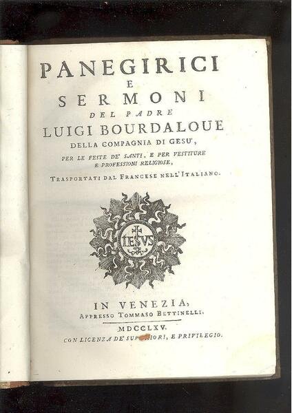 IN 4 antico ( cm.25 X 19 ), c.4, pp.304, LEGATURA D'EPOCA IN MEZZA PELLE CON TITOLO IN ORO ENTRO TASSELLO VERDE, PIATTI MARMORIZZATI. PADRE BOURDALOUE LOUIS<BR>( 1632 - 1704 ), DELLA COMPAGNIA DI GESU', GESUITA E PREDICATORE FRANCESE, PROF. DI TEOLOGIA, RETORICA E FILOSOFIA. NOTO PER L'ELOQUENZA PROFUSA NEI SERMONI CHE RECITAVA. LE SUE DOTI RETORICHE E LA SUA CULTURA GLI VALSERO DI PREDICARE ALLA CORTE DI LUIGI XIV, COSICCHE' ERA CHIAMATO " RE DEI PREDICATORI". VENNE CONSIDERATO COME IL PIU' GIANSENISTA TRA I MEMBRI SEICENTESCHI DELLA COMPAGNIA DI GESU', E COME IL FONDATORE DELL'ELOQUENZA CRISTIANA FRANCESE. BEL FRONTESPIZIO INCISO, FINALINI E CAPILETTERA ISTORIATI. MINIMA MENDA AL DORSO NEL PIEDE ALLA CERNIERA, ALTRIMENTI OTTIMA CONSERVAZIONE GENERALE. TESTO SU DUE COLONNE. ID 4072