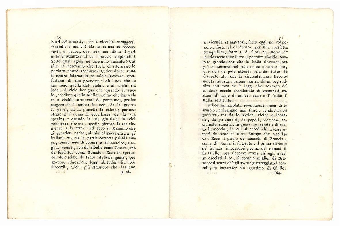 "Fu questa orazione nella sala dell'Accademia pisaurica nel dì anniversario della coronazione italica di Napoleone I. alla presenza del sig. gerenale Julien, del sig. Resti Ferrari Vice-prefetto e delle autorità civili e militari". Seguono versi di Bartolomeo Borghesi, Girolamo Zappi, Filippo Ronconi, Pietro Petrucci, Eduardo Bignardi, Pierfrancesco Serra, Luigi Ciacchi e Francesco Cassi.