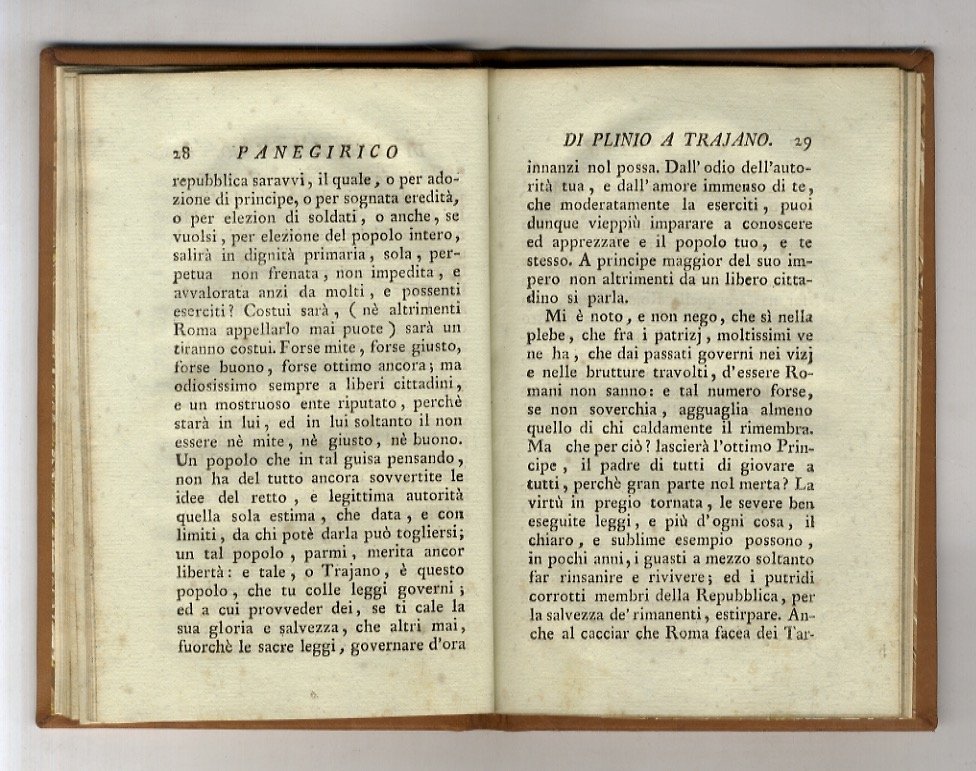In Nizza, presso la Società Tipografica, 1788, in-8 piccolo, legatura moderna in piena pelle, titolo e fregi in oro al dorso, piatto anteriore inquadrato da cornice in oro con tiotlo al centro, pp. 69, [3], l'ultima carta bianca. Celebre falso letterario nel quale Alfieri veste i panni dell'intellettuale che chiede all'imperatore di rinunciare al proprio potere per rendere ai sudditi la libertà. Edizione d'un anno successiva all'originale. Condizioni più che buone.