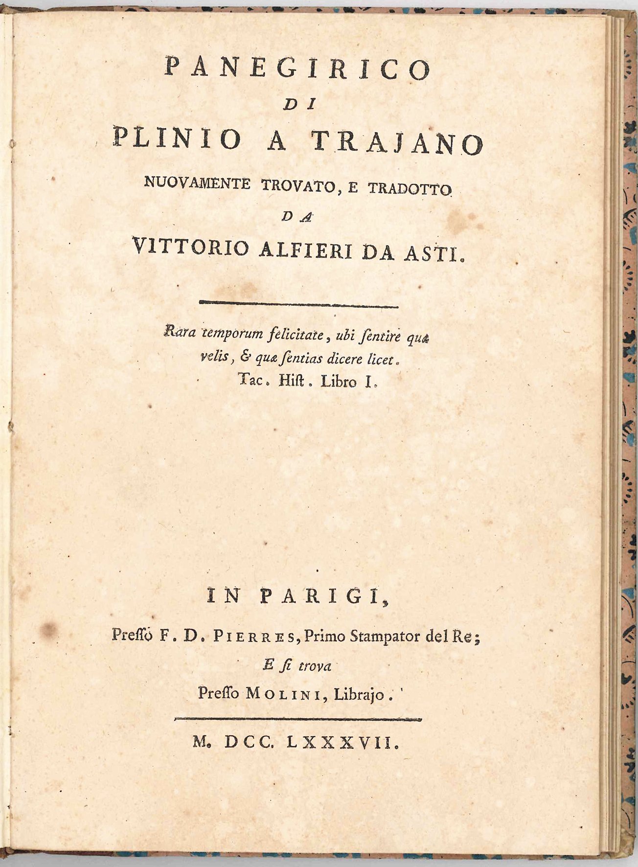 Prima edizione, stampata in soli 525 esemplari, di questo celebre falso letterario, fondamentale documento del passaggio dall'età delle riforme a quella rivoluzionaria, in cui Alfieri veste i panni dell'intellettuale che chiede all'imperatore di rinunciare al proprio potere per rendere ai sudditi la libertà. Nel 1785 Vittorio Alfieri aveva letto le epistole di Plinio il Giovane, restando entusiasta del loro contenuto, del loro stile e della personalità del loro autore. Fu invece fortemente deluso dalla lettura del Panegirico rivolto dallo stesso Plinio all'imperatore Traiano, deprecandone il carattere encomiastico e retorico, e decise perciò di scrivere un nuovo Panegirico a Traiano, più aderente allo spirito del Plinio delle epistole, e veramente tacitiano nella forma e nello stile, fingendo che si trattasse di una autentica opera di Plinio da poco scoperta in un “manoscritto antico nuovamente trovato”. Nella primavera del 1787, trovandosi a Parigi dove si era trasferito con la contessa d'Albany con l'intenzione di stampare in degna veste tipografica le sue tragedie, pensò di “fare una prova dei caratteri e proti e maneggi tipografici parigini” e affidò allo stampatore Philippe-Denys Pierres la pubblicazione del suo Panegirico. Così l'8 maggio di quell'anno poteva scrivere al suo amico senese Bianchi: “frattanto è uscito alla luce il Panegirico stampato come ella vedrà non male, e senza nessun errore”. In realtà il poeta astigiano non rimase pienamente soddisfatto del lavoro del Pierres, e si rivolse, per la stampa delle Tragedie, a François-Ambroise Didot, il più rinomato tipografo francese del tempo. Terminata nel 1789 l'impegnativa stampa dei sei volumi delle Tragedie, l'incontentabile Alfieri volle pubblicare una nuova edizione del Panegirico, degna di competere con le produzioni del Bodoni, e la affidò sempre a Didot.