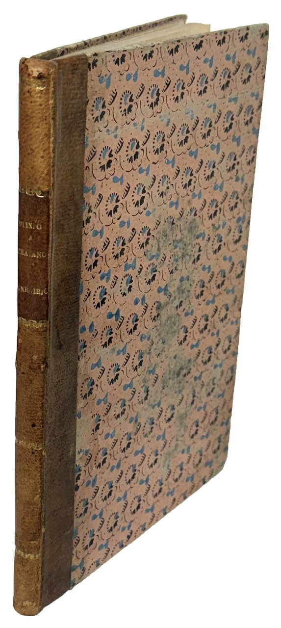 In 8vo (mm. 201x140). Pp. 61, [3]. Ultima carta bianca. Mezza pelle di poco posteriore con titolo in oro su tassello e filetti in oro al dorso, piatti ricoperti di carta decorata (spellature al piatto anteriore). Nota di possesso al risguardo libero: “Di Pell.no Bosi”. Uniforme e leggera brunitura delle pagine dovuta alla qualità della carta.