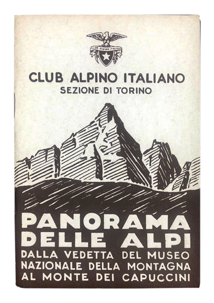 CLUB ALPINO Italiano - Sezione di Torino. In-16° (cm. 17,5x12), con pp. (2) + una lunghissima TAVOLA di 171x12 cm. e con 143 nomi indicanti località, colli, valli, cime dell'intero ARCO ALPINO occid., dalla Val Varaita al Monte Rosa, Serra d'Ivrea a Superga. Cartoncino leggero edit. con, A RILIEVO a secco, GRAFICA el MONVISO e gran titolo in cop. Disegno datato 1942 di Renato CHABOD politico, avvocato e alpinista italiano, senatore dal 1958 al 1968. Ricercata e rara prima ed., censita in sole 5 bibl. Esemplare perfetto, come appena uscito dallo stampatore!