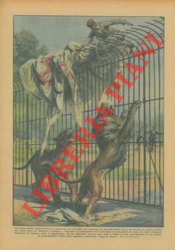 Paracadutista inglese, gettatosi da un aeroplano per scendere in un aerodromo, viene portato dal vento sopra un Giardino Zoologico impigliandosi col paracadute nell'inferriata di una gabbia di leoni.