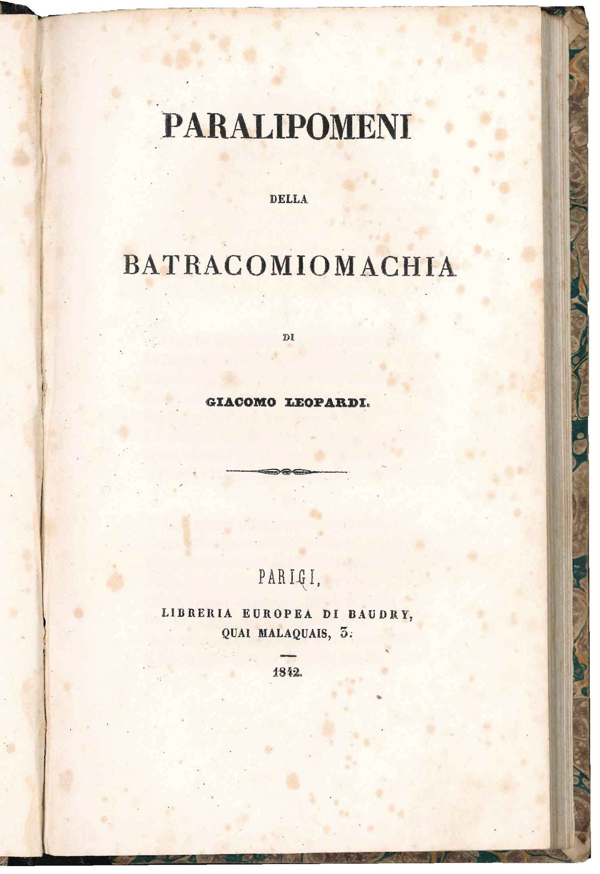 Prima edizione del celebre poemetto satirico in ottava rima, iniziato da Leopardi nel 1830 e terminato la sera prima della morte avvenuta il 14 giugno 1837, secondo la testimonianza dell'amico Antonio Ranieri che si occupò di pubblicarlo postumo a Parigi. Qualche anno più tardi, l'editore fiorentino Le Monnier, per completare l'edizione delle Opere di Giacomo Leopardi da lui curata nel 1845, comprò le rimanenze di Baudry e le mise in vendita, sostituendo la brossura gialla originale con una nuova brossura rosa. Il successo tuttavia fu notevole e, una volta esaurita la scorta, il Le Monnier provvide a ristampare l'edizione per due volte, lasciando però invariato il frontespizio originale riportante i dati tipografici del Baudry. Le due ristampe fiorentine si distinguono per le varianti testuali e per l'uso di diversi caratteri di stampa. In particolare a p. 53, r. 1 “MARAVIGLIA” è cambiato in “Maraviglia” e a p. 22, r. 8 il corretto “carrozzevole” è sostituito dalla lectio facilior “carezzevole”. A complicare ulteriormente le cose, in quegli anni apparve anche una contraffazione napoletana, che tuttavia si distingue facilmente per avere 108 pp. e quattro stanze per pagina anziché tre. Leopardi aveva pubblicato una sua traduzione in sesta rima della Batracomiomachia già nel 1816. I Paralipomeni sono un'opera satirica che rappresenta una sorta di compimento delle decennali ricerche leopardiane sul celebre poemetto pseudo-omerico.