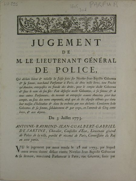 Parfum - Jugement de M. Le Lieutenant Général de Police du 3 Juillet 1773