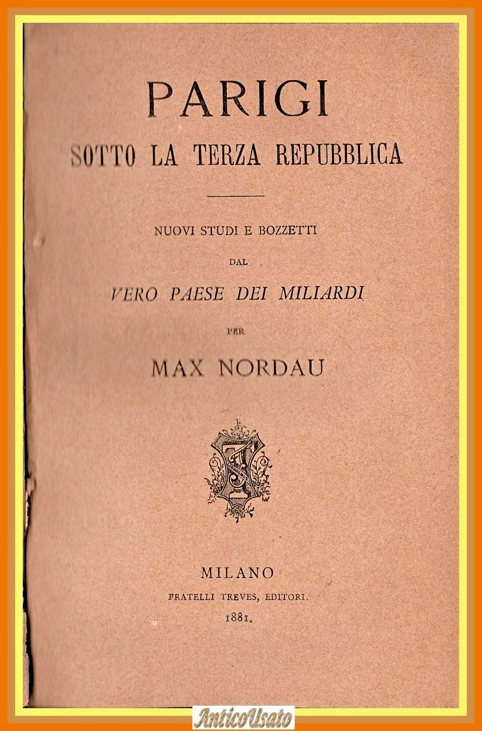 PARIGI SOTTO LA TERZA REPUBBLICA Nuovi Studi e Bozzetti dal vero Paese dei Miliardi di Max Nordau. Milano, fratelli Treves Editore, 1881 . 438 pagine. Copertina non editoriale in mezza pelle. Stato di conservazione: molto buono (pagine ingiallite) Libro antico saggistica storica