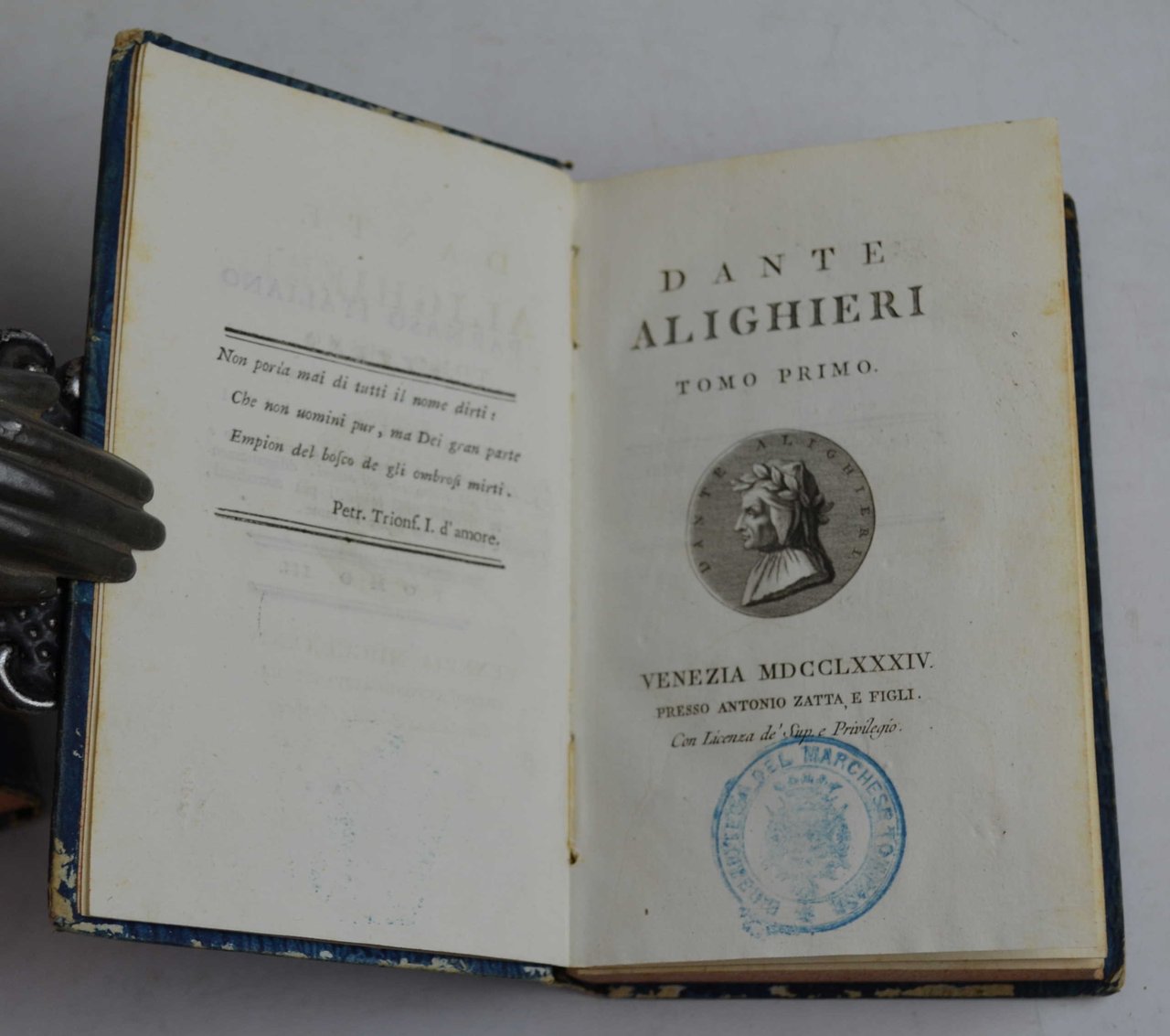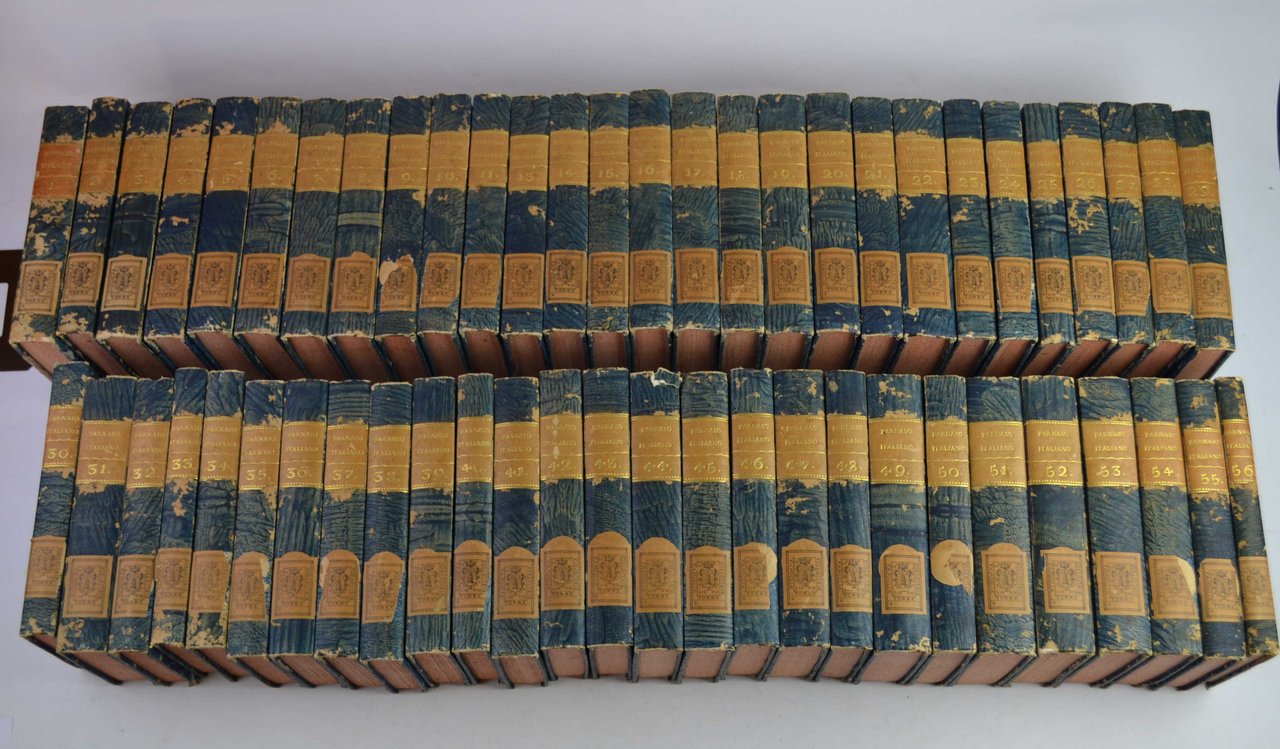Cinquantacinque (di 56!) volumi di cm. 16, pp. 250-400 circa ciascuno. Un medaglione inciso al frontespizio di ogni volume, ritratti e oltre 700 finissime incisioni in rame nel testo. Gli artisti che hanno adornato l'opera di figure sono Dall'Acqua, Baratti, Zuliani, Daniotto, ecc. Legatura del tempo in cart. rigido marmorizzato con titoli in oro su tasselli ai dorsi. Piccole abrasioni superficiali alle legature (senza gravità), ma complessivamente in ottimo stato di conservazione. Esemplare proveniente dalla biblioteca del Marchese Tommasi, con suo timbro di possesso ai frontespizi ed etichetta ai dorsi. Presente anche l'ex libris di Mario ed Elena Spagnol. Raccolta delle opere più classiche della letteratura italiana. da Dante a Frugoni, cui fece da curatore Andrea Rubbi. Nell'ultimo volume si trova l'indice completo dell'opera. Privo del volume dodicesimo (secondo dell'Orlando innamorato del Berni).
