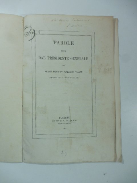 In 8, cm. 15 x 23, pp. 14. L'esemplare e' privo di brossura. Dedica autografa dell'autore al margine superiore del frontespizio. Conclusioni al termine del Congresso Pedagogico Italiano nell'ultima tornata del 10 settembre 1864. Estratto dal Giornale fiorentino "La gioventu'" , Vol. VI, Quaderno del settembre 1864.