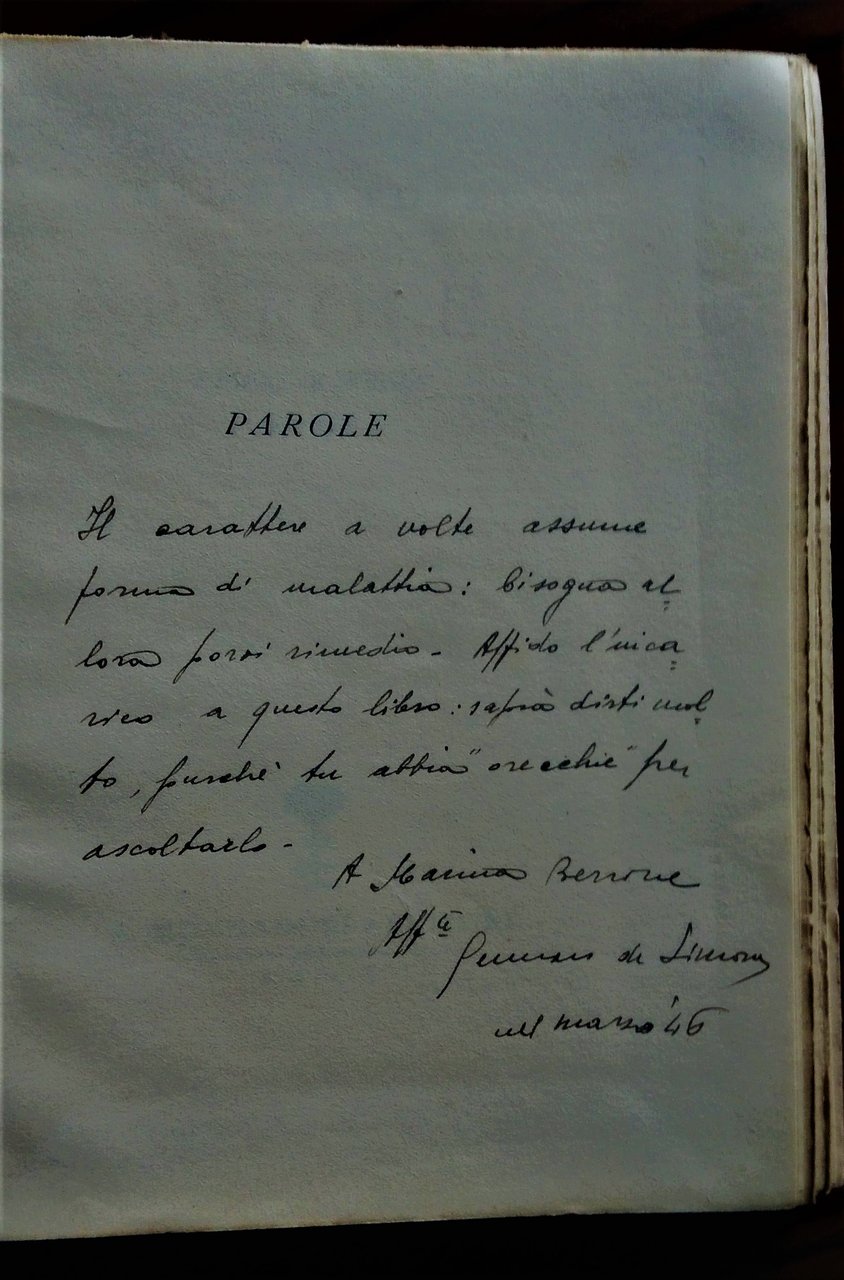 Milano, Mondadori, 1943 (maggio). 8°, pp. 283,(3), ritratto fuori testo protetto da velina, brossura editoriale. Lunga dedica alla prima carta bianca. Esemplare allentato, leggere bruniture e minimi difetti alla brossura, bella copia.