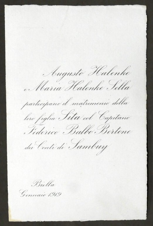 Partecipazioni Nozze capitano Federico Balbo con la signorina Sita Sella - 1919