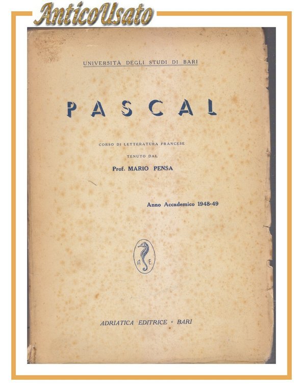 PASCAL di Mario Penso corso letteratura francese 1948 49 Adriatica libro scuola