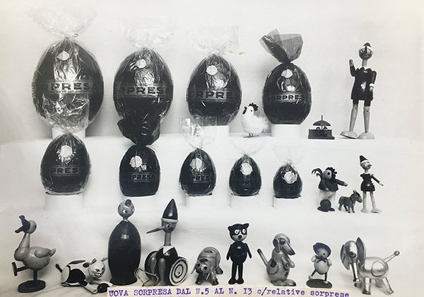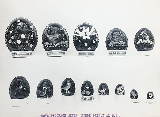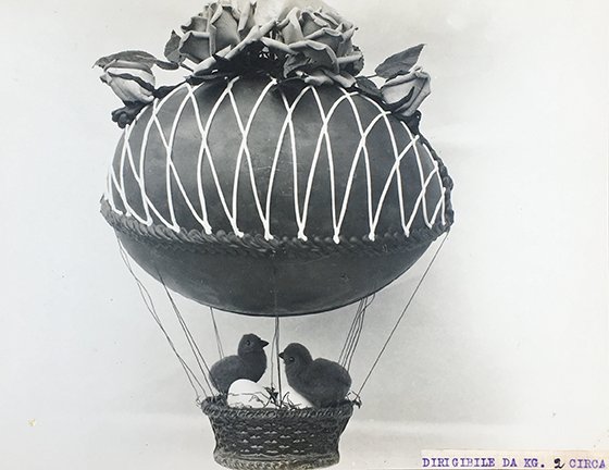Album oblungo di cm. 31,1x21,7, in cartone ricoperto di tela granulosa nera legato da cordoncino in stoffa ritorta passante presso il dorso. Interno di 23 supporti in cartoncino marron su cui sono applicate le 24 foto lucide in bianco nero, la prima con i visibili riflessi di sali d'argento, 22 solo recto perlopiù protette da veline e due recto e verso. Una foto parrebbe asportata. Le didascalie sono dattilografate su striscette incollate in calce o in cima alle foto e dichiarano il peso e talora le misure. Dalle descrizioni si evince che si trattava di un LABORATORIO che serviva molte pasticcerie,.Gli ornamenti o accessorr delle uova pasquali sono: Cattedrale di San Giusto di Trieste (mezzo uovo per vetrina, altezza cm. 80, peso 39/40/50 Kg. ! - cosa che farebbe pensare alla Grande Guerra o alla vittoria del 1918), grandi uova intere dipinte per vetrina con scene di damine e giardini, carroccio con ruote nidiata e rosa tirato da galline, dirigibile con appesa nidiata (anche questo allude al periodo bellico), anfora, uova semiaperte con fiori o nidi o pupazzi, o decorate con o senza piede o stagnola. Inoltre, gallinelle, cestini, poetauova, fungo, chioccia, ochette, moretti, tronchetti, animali vari, nidi, pesci, scarpette, automobiline (tipo inizio '900). Pinocchio, decorazioni in seta, uova-bonbon ecc. Il nome della pasticceria appare sull'etichetta di un uovo; Pierino Pianetta, ultracentenario nel 2007 ricordava che nel settembre 1920, a 16 anni vi trovò lavoro come garzone, nel laboratorio di via Stelvio (ilgiornale.it. 30-11-2007).
