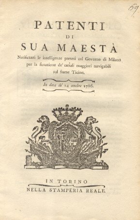 Patenti di Sua Maestà riguradante la notificazione delle intelligenze presesi col Governo di Milano per la fissazione de' canali maggiori navigabili sul fiume Ticino.