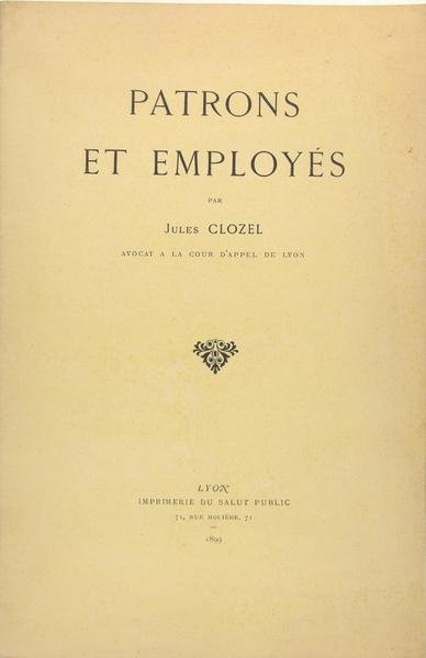 Imprimerie du salut public, Lyon, 1899. Plaquette in-8 (24 x 16 cm) couverture imprimée, 22 pages. CLOZEL Jules avocat a la cour d'appel de Lyon débat dans la présente plaquette de la rupture du contrat de louage sous l'empire du Code civil.