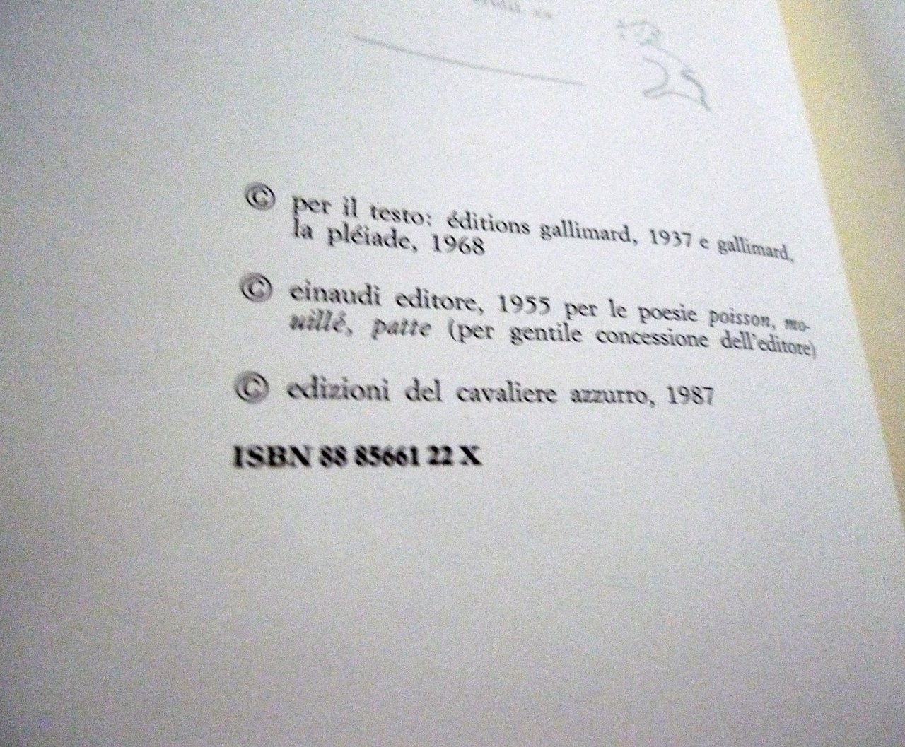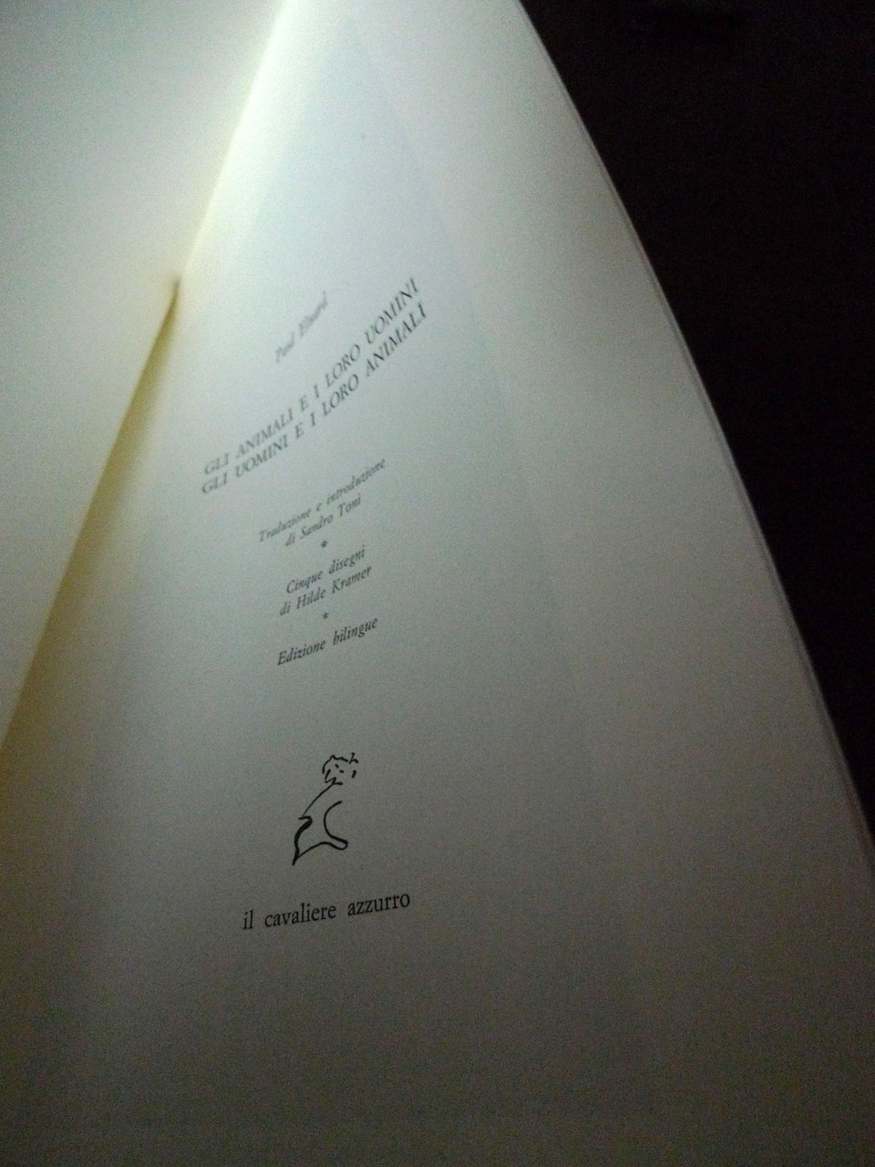 Paul Eluard,GLI ANIMALI E I LORO UOMINI.GLI UOMINI E I LORO ANIMALI.Traduzione e introduzione di Sandro Toni.Cinque disegni di Hilde Kramer.EDIZIONE BILINGUE.Edizioni del Cavaliere Azzurro, 1987,TIRATURA DI 1.010 COPIE,brossura, 25x18 cm., pp.55,illustrazioni in bianco e nero,testo originale francese con traduzione italiana a fronte,ISBN: 88-85661-22-X,peso: g.300cod.9966CONDIZIONI DEL LIBRO: come nuovo,intonso (fogli chiusi)