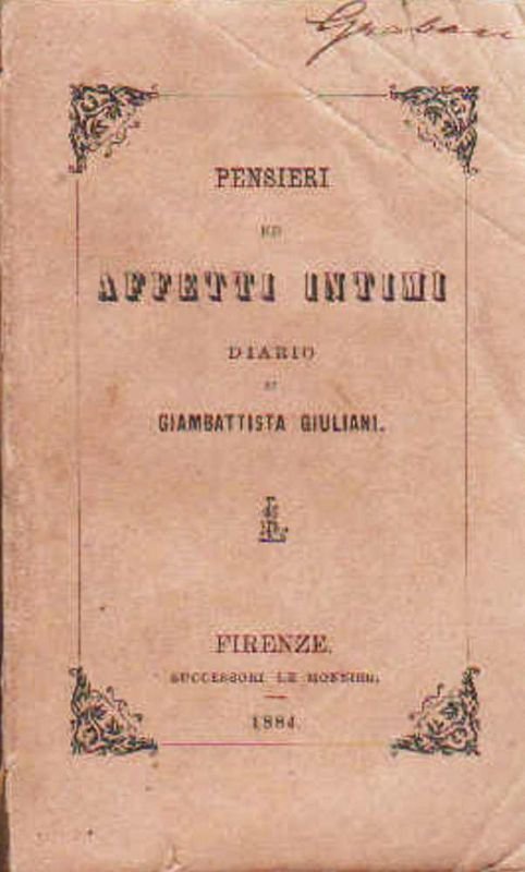 In-32°, legatura editoriale nella brossura caratteristica dell'Editore fiorentino; pp. 2 bb., XII, 387(1). Jacopo Giuliani, più noto col nome secolare di Giambattista GIULIANI (Canelli, 4 giugno 1818 – Firenze, 11 gennaio 1884), è stato un filologo, linguista e storico della letteratura italiano; chierico regolare di Somasca, è considerato fra i principali dantisti del XIX secolo. Il presente Diario, pubblicato postumo ma per volere dell'Autore, copre un anno di vita; sempre per volere dell'autore, e degli eredi - come si apprende dal Proemio firmato Gli Editori -, il ricavato delle vendite fu interamente devoluto in beneficenza. Rara edizione originale di questi scritti di meditazione e di argomento personale, cui seguì una cinque anni più tardi per i tipi di Treves. Firma d'appartenenza nobiliare ottocentesca nell'angolo superiore sinistro del piatto anteriore; piccoli difetti e segni di piegature alla brossura; per il resto un buon esemplare.