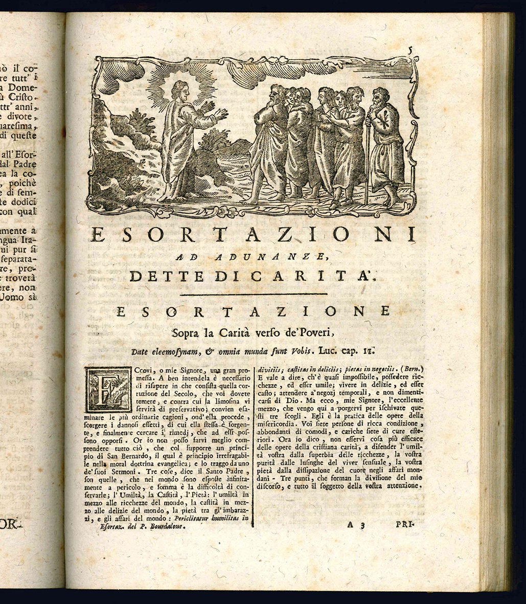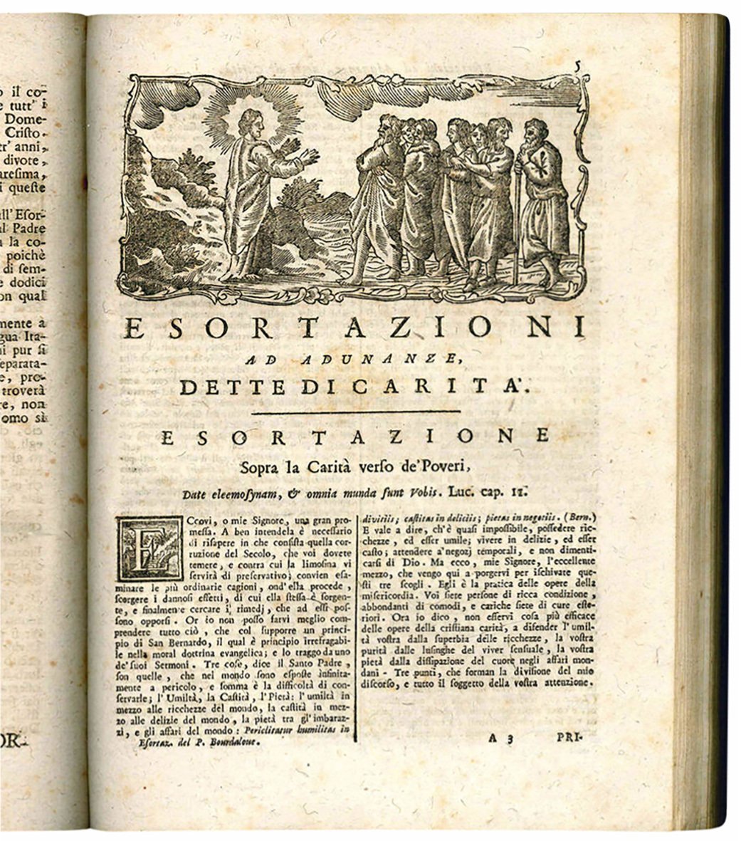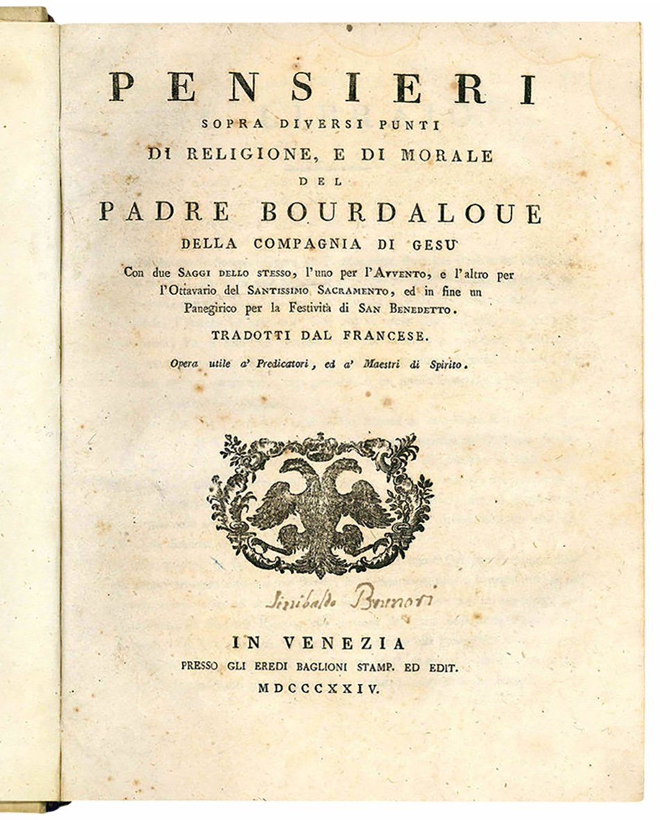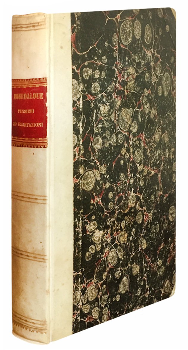 Pensieri sopra diversi punti di religione, e di morale del padre Bourdaloue della compagnia di Gesù. Con due saggi dello stesso, l'uno per l'Avvento, e l'altro per l'ottavario del Santisssimo Sacramento, ed in fine un panegirico per la festività di San Benedetto. Tradotti dal francese. (legato con:) Esortazioni ed istruzioni cristiane.