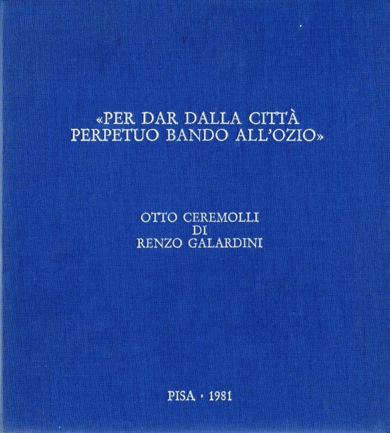 Per dar dalla città perpetuo bando all'ozio, prima edizione marzo 1981, formato 23,5 x 26.Copertina rigida in tela blu con titoli in argento. La cartella è composta da otto ceremolli originali tirate in 80 copie numerate e firmate dall'autore.Lievi bruniture in alcune pagine. Nel complesso ottime condizioni.
