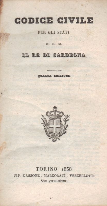 In-8°, legatura coeva con tit. in oro e fregi a secco al dorso, pp. 360 e 35(1) di Regie Lettere Patenti. Legatura staccata dal corpo del volume. Il Codice civile per gli stati di Sua Maestà il re di Sardegna fu promulgato da Carlo Alberto il 20 giugno 1837 ed entrò in vigore nel Regno di Sardegna il 1º gennaio 1838. Il codice comprendeva 2415 articoli suddivisi in tre libri, seguendo la tripartizione del Code Napoléon: persone; diritti reali; successioni e contratti. Dopo l'Unità d'Italia, il codice civile sardo non fu automaticamente esteso a tutte le regioni italiane, dove, invece, rimanevano in vigore le legislazioni precedenti. Una legislazione uniforme per tutto il Regno d'Italia si ebbe col codice civile del 1865.