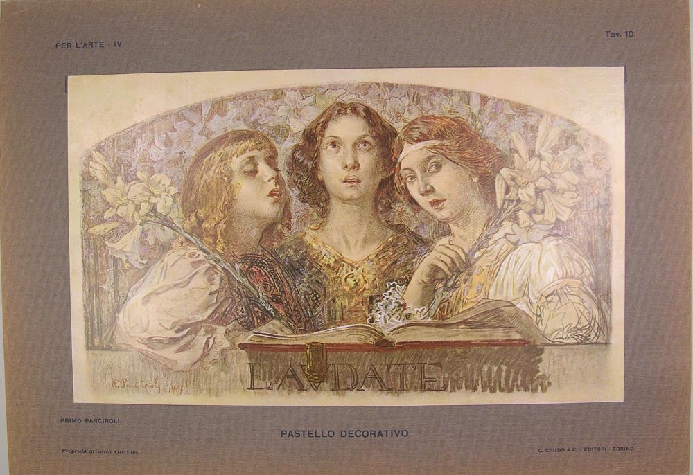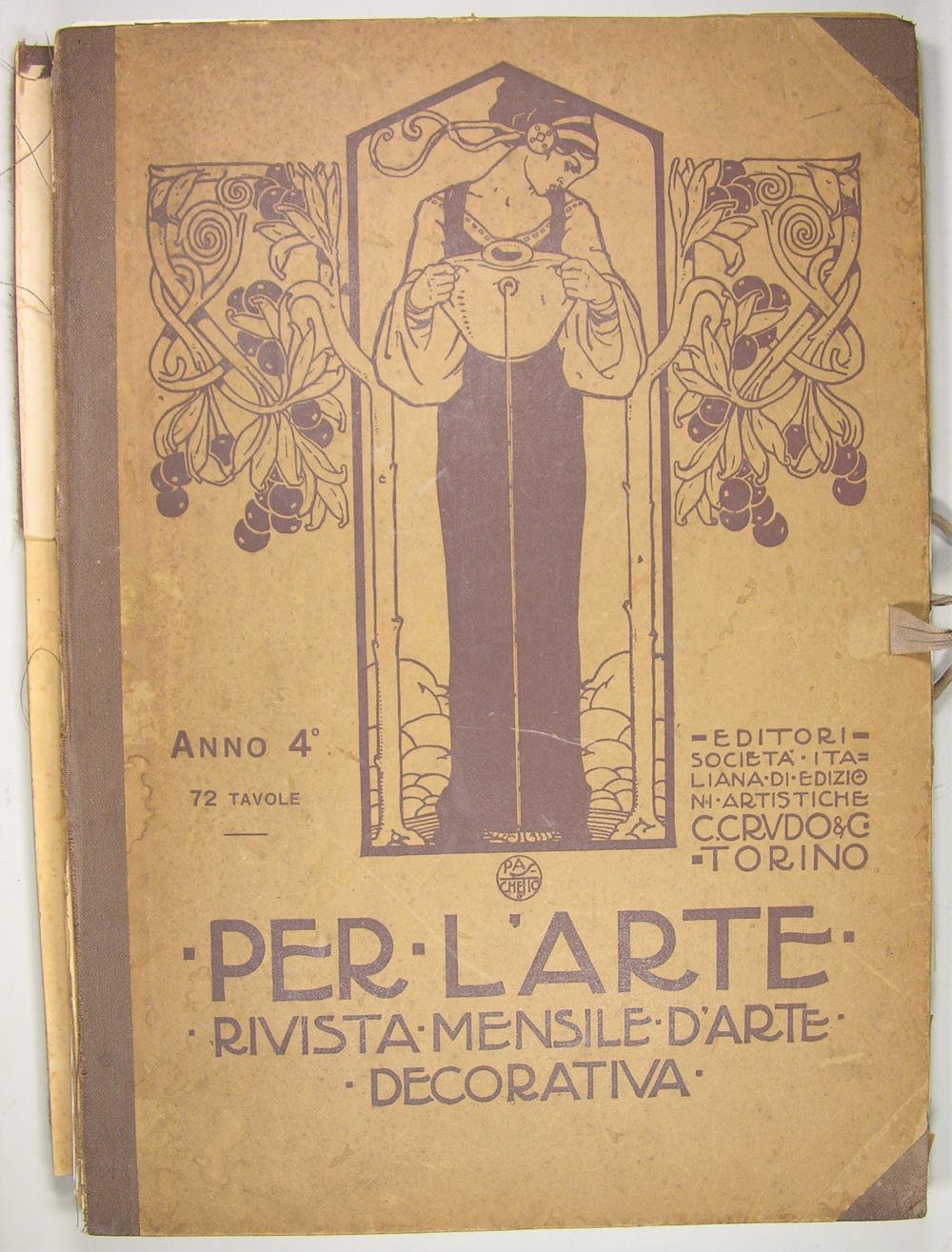 Editori societa Italiana di edizioni artistiche C. Crudo & C Torino 1912, Anno 4°. In folio en feuilles dans une reliure éditeur, plat carton illustré, dos toile mais comme souvent cassé. 72 tavole, mais avec des manques pages 17-38-44 et 48. Planches en noir et blanc et des planches en couleurs. "Les arts décoratifs sont pratiqués par les métiers d'art traditionnellement définis par leurs productions ornementales et fonctionnelles, par les techniques utilisées et par les matériaux auxquels ils donnent forme : la céramique, le bois, le verre, le métal, le textile, le stuc ou la pierre, voire la pierre précieuse. En France, le concept apparaît dans les années 1840, et s'exprime au singulier : la littérature, la presse parle d'« art décoratif », sans connotation péjorative, pour distinguer certaines réalisations liées aux aménagements internes à un bâtiment ainsi qu'à ses différents mobiliers. Ainsi quand le style troubadour, lié à la vogue romantique, devient à la mode, le regard se porte sur l'art décoratif lié aux XIVe - XVIe siècles — ou, du moins, tel que l'on se l'imaginait en ce temps."
