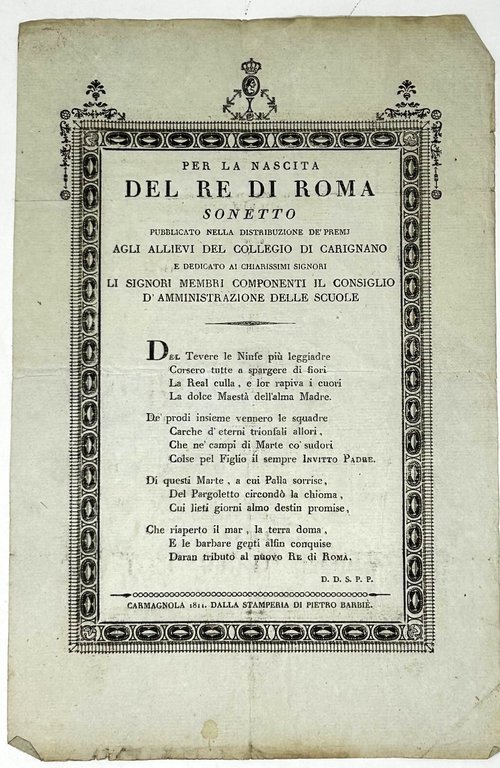 >foglio sciolto (320x210 mm), testo elegantemente impresso entro cornice ornamentale sormontata da stemma coronato. Curioso sonetto, pubblicato a Carmagnola per gli allievi del Collegio di Carignano, in occasione della nascita di Francesco Giuseppe Carlo Napoleone (1811-1832),  figlio di Napoleone e della sua seconda moglie Maria Luigia. Il nascituro acquisì subito il nome di Re di Roma, seguendo l'antico costume degli imperatori germanici.  Fu per due settimane imperatore dei francesi con il nome di Napoleone II. L'Aiglon, come lo definì Victor Hugo, fu di salute cagionevole sin dalla prima infanzia. Nel 1832 Maria Luigia da Parma venne chiamata d'urgenza a Vienna, e trovò a Schönbrunn il figlio ventunenne in fin di vita per via della tubercolosi. Il sonetto è stato impresso su carta lievemente verzolina da Pietro Barbiè, la cui famiglia installò nel paese piemontese una tipografia già nel XV secolo.