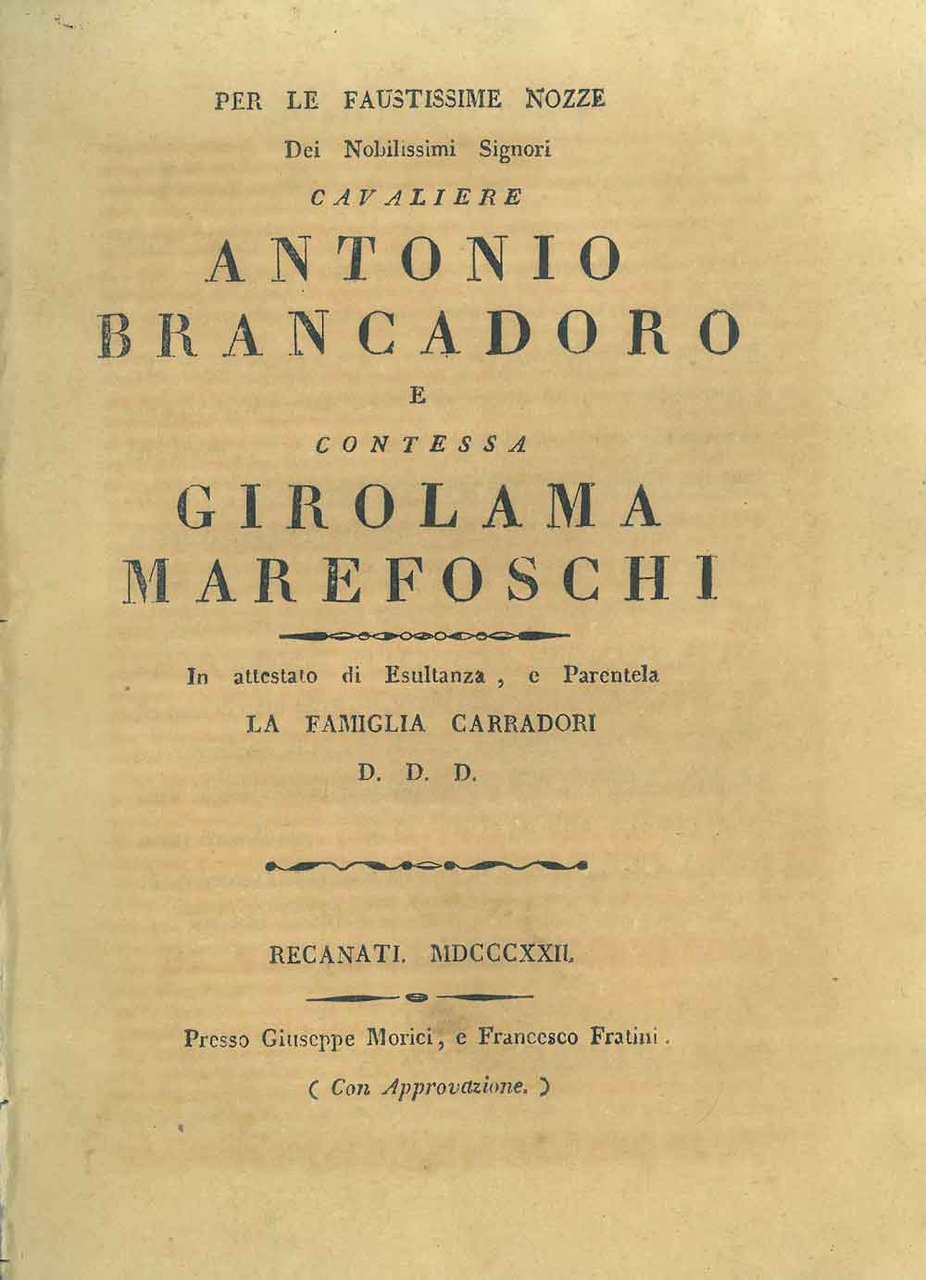 Per le faustissime nozze dei nobilissimi Cavaliere Antonio Brancadoro e Contessa Girolama Marefoschi in attestato di esultanza, e parentela la famiglia Carradori
