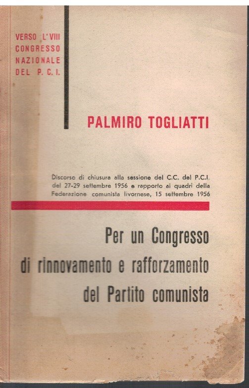 Brossura con segni e piccola mancanza come da foto. Interno molto buono. Si tratta del discorso di chiusura del congresso del 27-29 settembre 1956. L'opera è ben conservata in rilegatura solida
