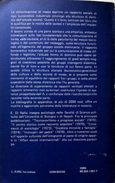 Soggetti: Mass Media, Filosofia, Teoria, Teorie e pratiche della comunicazione e dei media, Manuali, Libri Vintage, Fuori catalogo, Scienze sociali, Comunicare, Sociologia, Mezzi, Marxismo, Liberalismo, Propaganda, Fruizione, Divulgazione, Cultura, Soft power, Giornalismo, Quinto Potere, Pubblicità, Reclame, Spot, Immaginario, Alienazione, Burocrazia, Weber, Cinema, Film, Storia, Seminari, Controinformazione, Controcultura, Campionatura, Saggi, Bibliografia, Giornali, Dichiarazioni, Periodici, Documenti, Radio, Televisione, Internet, Fourier, Tribalismo, Canzone, Testi, Fabbriche, Tecnologia, Università, Marshall McLuhan, Philosophy, Theory, Theories and Practices of Communication and the Media, Manuals, Discontinued Books, Social Sciences, Communicating, Sociology, Liberalism, Fruition, Dissemination, Culture, Journalism, Fifth Power, Advertising, Claims, Imaginary, Alienation, Bureaucracy, History, Seminars, Counter-information, Counterculture, Sampling, Essays, Bibliography, Newspapers, Statements, Periodicals, Documents, Television, Tribalism, Songs, Texts, Factories, Technology, University