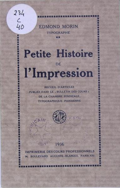 Imprimerie des cours professionnels, Paris, 1936. Plaquette in/12 brochée, couverture imprimée, 37 pages. Une étiquette contre collée sur la couverture ; tampons de bibliothèque.Recueil d’articles publiés dans le “Bulletin des cours” de la Chambre Syndicale Typographique parisienne.