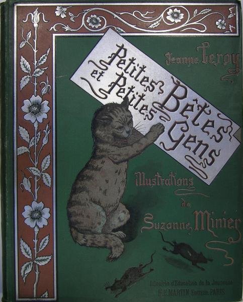 Librairie H. E. Martin éditeur, Paris, s.d. (1880). In/4 (32 x 26 cm) reliure percaline éditeur verte illustrée argent et brique, doré trois tranches, illustrations de Suzanne Minier 108 pages, 11 f. (15 p. de table & 5 f. de catalogue illustré). Exemplaire très frais hormis des coiffes et un coin amorti. Rose-Jeanne-Mathilde, sœur aînée d'Alphonse Allais, est née le 16 janvier 1853 à Honfleur. Alphonse et Mathilde eurent toujours des liens fraternels très forts. Lorsqu'il s'inscrit à l'Ecole Supérieure de Pharmacie, Mathilde accompagne son frère à Paris où elle enseigne comme institutrice libre. Elle rencontre et épouse Charles Leroy, un ami parisien d'Alphonse et rédacteur au journal "Le Tintamarre". Écrivain, elle publie sous le nom de Jeanne Leroy-Allais, dix-sept ouvrages : romans (dont deux couronnés par l'Académie Française : "Marie-Rose au couvent" et "Âmes vaillantes"), études de Morale et de Sociologie, des livres-albums pour enfants dont certains sont illustrés par Benjamin Rabier ("Chez les Bêtes," " Le Roman de Renard", " L'homme qui comprend le langage des animaux"). En 1913, Mathilde publie un livre sur son frère Alphonse : "Alphonse Allais, souvenirs d'enfance et de jeunesse "
