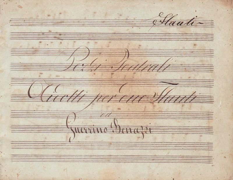 35 fogli pentagrammati formato album, cm. 29x22,5 con cavatine adattate per flauti. Tracce del tempo ma ottima conservazione.
