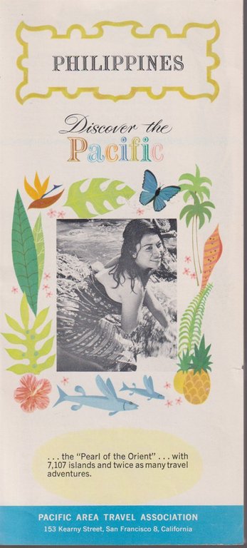 A colorful travel brochure promoting Alaska, Australia, Burma, Fiji, Hawaii, Hong Kong, India, Indonesia, Japan, Korea, Malaya, Macao, New Caledonia, New Zealand, Philippines, Samoa, Singapore, Tahiti, Taiwan, Thailand, Vietnam. Nd. [1950's? ] ; Oblong 8vo 8" to 9" tall