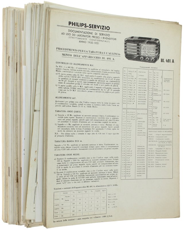 (Codice RA/0592) Collezione di 80 fascicoli tecnici relativi ad apparecchi prodotti dal 1950 al 1965. Ognuno di più pagine, formato 21x29,7 cm., con lo schema di ogni modello (elettrico e costruttivo), note tecniche per la taratura e allineatura dei radioricevitori, per la riparazione, anche di altri apparecchii (amplificatori, giradischi, ecc.).Con dettagli dei componenti. Lievi segni del tempo, ma in ottimo stato. ~~~ SPEDIZIONE IN ITALIA SEMPRE TRACCIATA