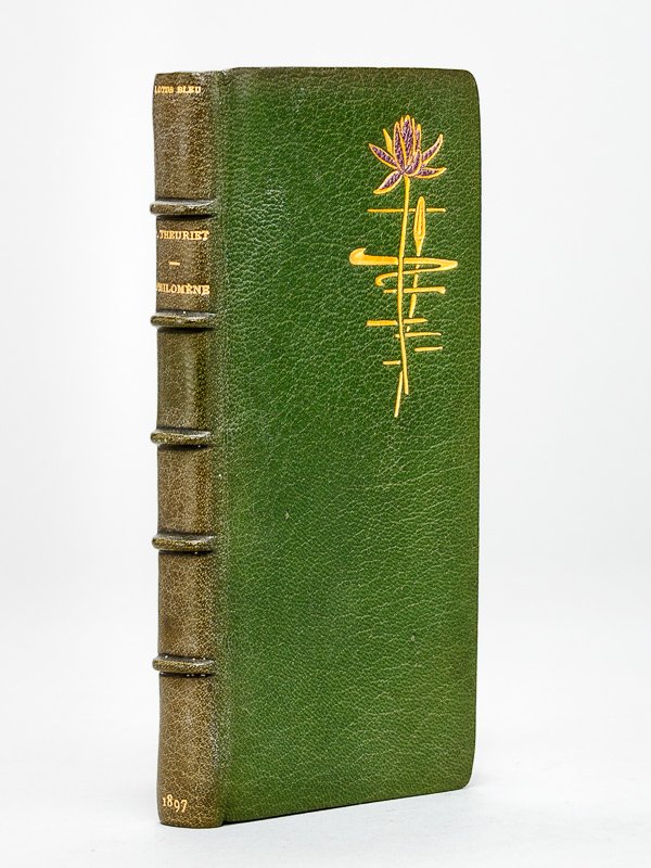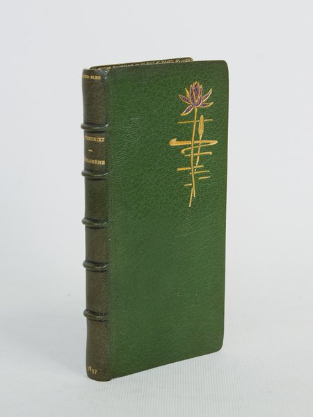 Illustrations de L. Marold, avec double suite des hors texte en sanguine, 1 vol. in-18 reliure plein maroquin vert, dos à 5 nerfs, lotus bleu mosaïqué au plat sup., chasses ornées, toutes tranches dorées, gardes moirées, première garde ornée d'un lotus doré (monogrammé XSX), couv. cons., date en queue, Nouvelles Collections Guillaume "Lotus Bleu", Librairie Borel, E. Guillaume, Paris, 1897, 10 ff., 72 pp., 4 ff. n. ch. Bon exemplaire superbement relié en plein maroquin orné de la belle fleur de lotus emblème de la collection (dos un peu foncé, 2 infimes petits mq. au plat sup)