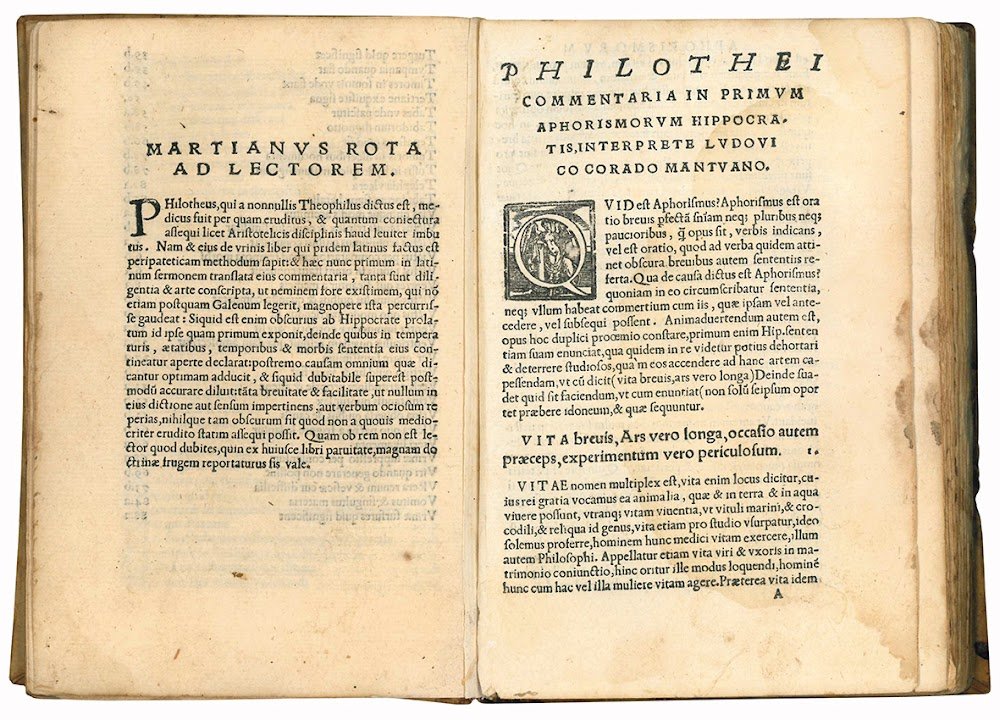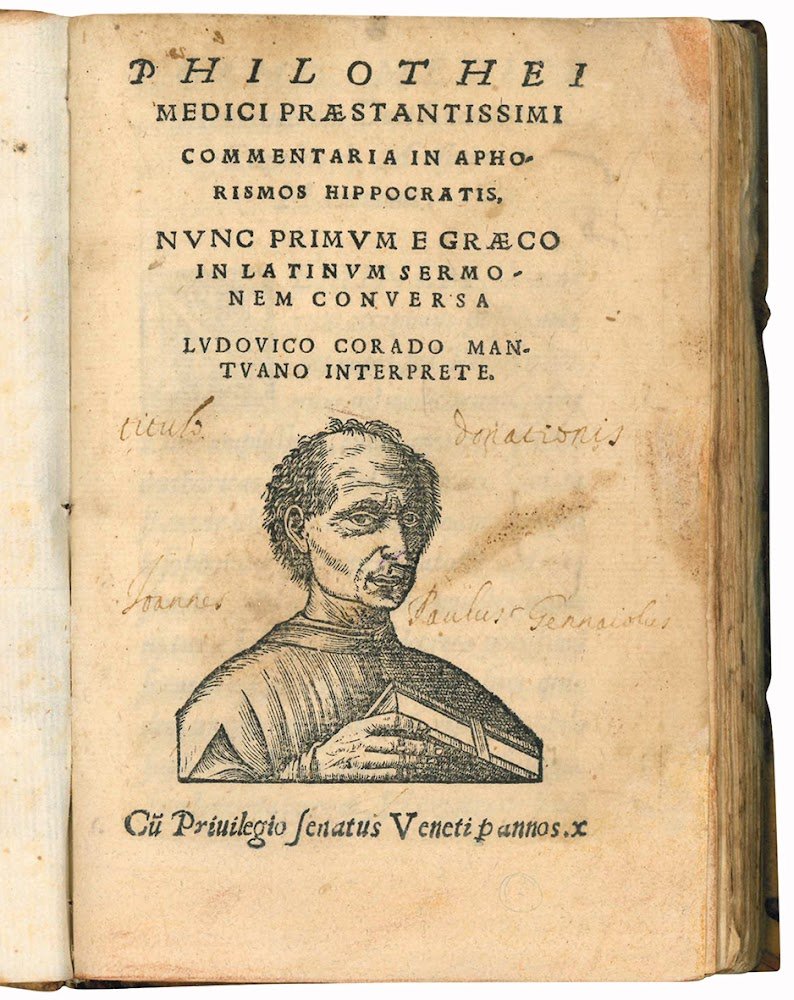 Rare first edition of Theophilus Protospatharius' commentary on Hippocrates' aphorisms in the Latin translation by the Mantua physician Ludovico Corrado (a second edition appeared in Speyer in 1581).