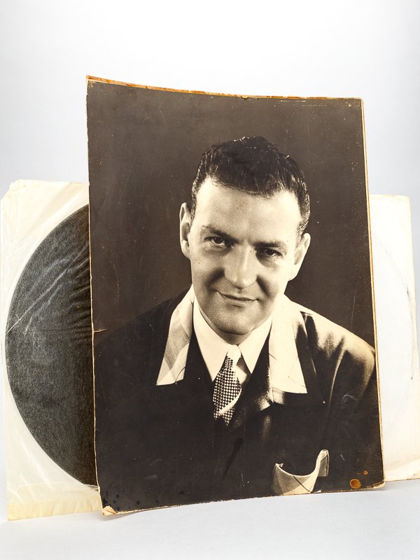 Photo grand format de Claude Larry, avec 3 disques (Test Pressing - Pressage de test), deux 33 tours (dont un avec mention au stylo STEC 121A, 18.1.72 et un 45 tours), s.d. [ circa 1954 -1970 ?] On joint une affiche de Claude Larry pour les disques Pacific (1954). Rare ensemble réunissant 3 pressages de test. Prix du lot, non séparable.