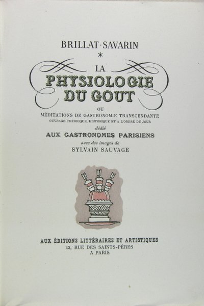 PHYSIOLOGIE DU GOUT ou Méditations de Gastronomie Transcendante. Ouvrge théorique, historique et à l’ordre du jour dédié aux gastronomes parisiens