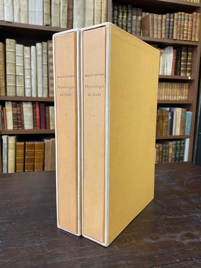 <span style="font-family: Arial, Verdana; font-size: 10pt; font-style: normal; font-variant-caps: normal; font-weight: normal;">2 volumi in-4° (cm. 28,8), pagine XXIX 237 [5], 259 [5] con 8 tavole illustrative fuori testo che ripropongono le incisioni Grimod de la Reyniere di primo Ottocento (pudicamente nascoste nel risvolto della piegatura e con didascalia), ai frontespizi stemma di Darantiere. Esemplare n. 125 della tiratura di 1000 </span><i><font face="Arial, Verdana" size="2">sur vélin Blanc pur chiffon des Papeteries Ventura de Cernobbio.</font></i><font face="Arial, Verdana" size="2"><i> </i>Brossure officinali a risvolti velinate, titoli in blu ai dorsi e ai piatti inquadrati da filetto, camicie e cofanetti in tela ocra. Edizione dedicata alla memoria del tipografo Maurice Darantiere, basata su quella di Just Tessier (1834) e con introduzione di Pierre Andrieu. Cfr. Pellizzari 136. Ottimo esemplare con lievissimi segni alle custodie. (NY)</font>
