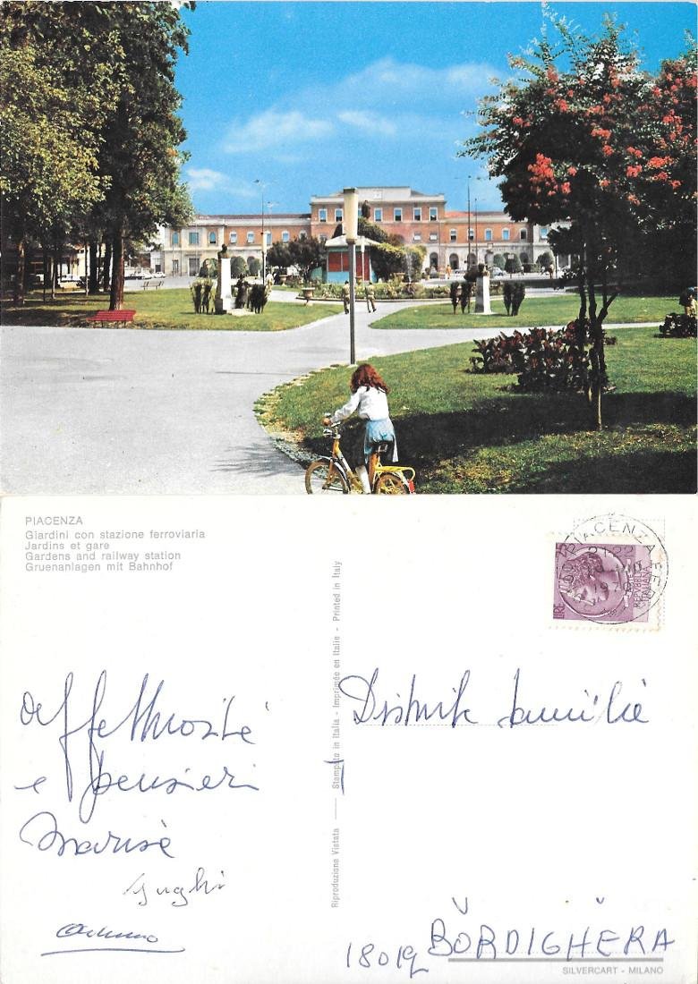 Piacenza. Giardini con la stazione ferroviaria. Viaggiata 1970