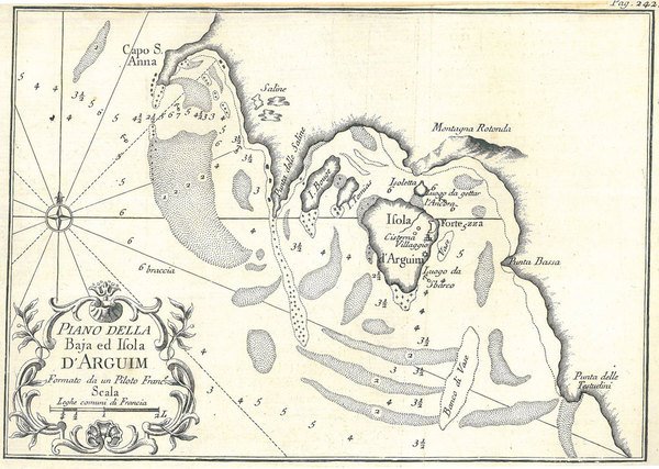 Piano della bja ed isola d'Arguim. Formato da un piloto francese. Tratto dall'opera "Storia generale de' viaggi o nuova raccolta di tutte le relazioni de' viaggi per mare, e per terra."