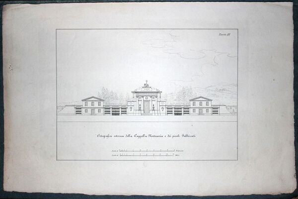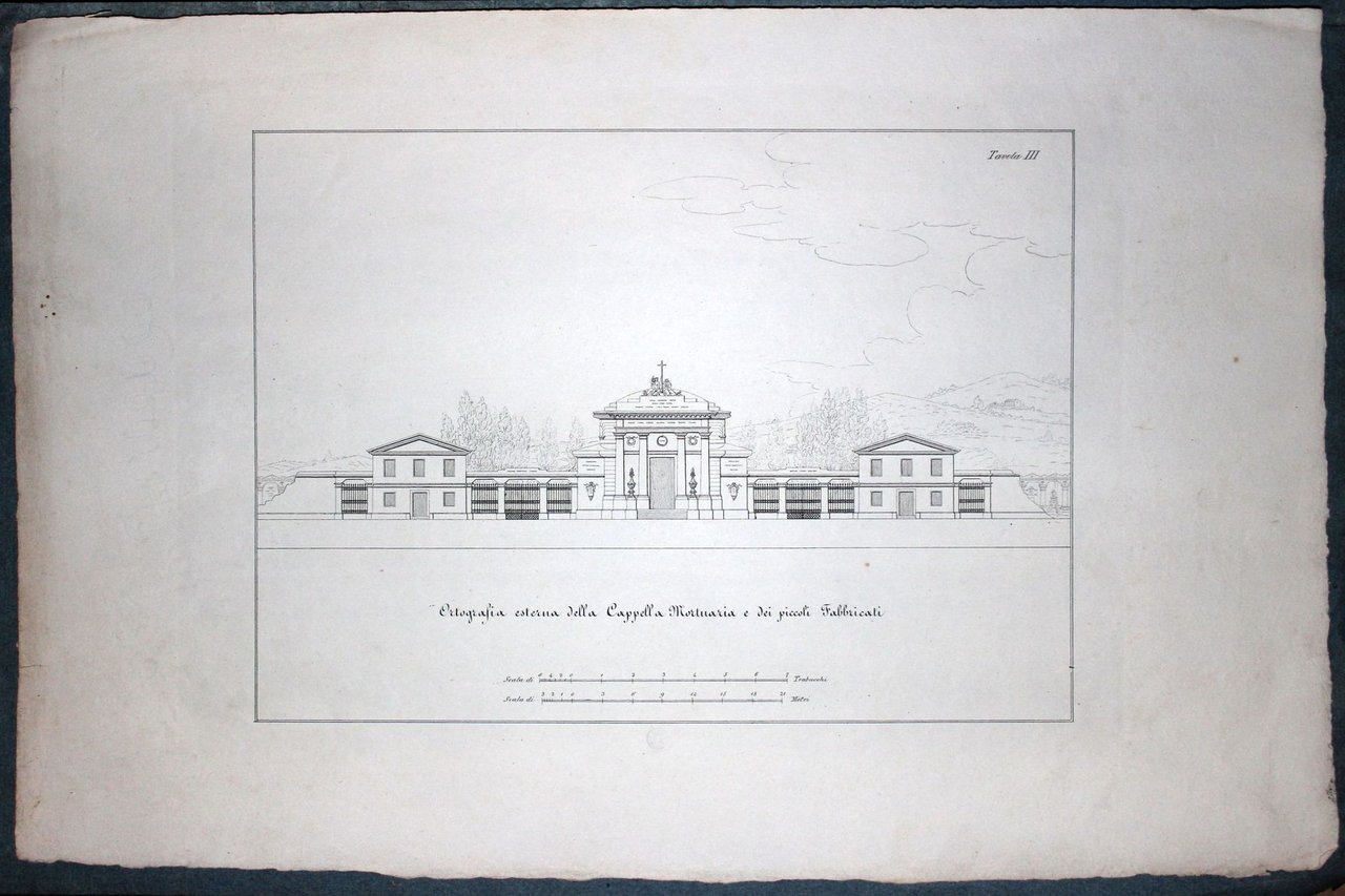 Cartella cm. 50 x 32,5 contenente tre stampe che presentano il progetto per il nuovo cimitero generale di Torino: I, piano generale; II, fenografia della camera mortuaria; III, Ortografia esterna della cappella mortuaria. Copertina originale azzurra con titoli a stampa. Il catalogo OPAC presenta due esemplari con un numero maggiore di tavole, la nostra copia porta una nota manoscritta coeva: Tavole 3, lire 3 che fa pensare che in un primo momento sia stata commercializzata con queste tre tavole.