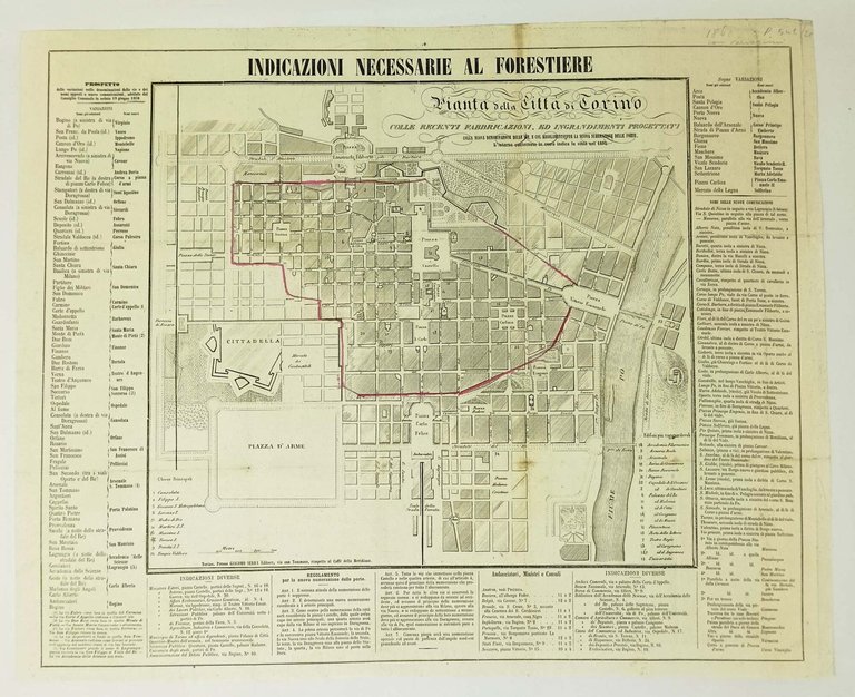 >Pianta litografica della città di Torino centrale, fuori dalla cornice incisione in rame di legenda (mm 440 x 540), anonima; titolo in alto a destra "Pianta della città di Torino | colle recenti fabbricazioni, ed ingrandimenti progettati | colla nuova denominazione delle vie, e col regolamento  per la numerazione delle porte. | L'interno contornato in rosso indica la città nel 1800". Fuori dalla cornice, in alto centrale, "INDICAZIONI NECESSARIE AL FORESTIERE". Entro la cornice, in basso a sinistra, indicazioni tipografiche "Torino. Presso Giacomo Serra Editore, via san Tommaso, rimpetto al Caffé della Meridiana". Lungo i lati sinistro, inferiore e destro, ampia legenda con le variazioni nelle denominazioni delle vie, adottate nel 1860. Curiosità: indicazione del nuovo regolamento per la numerazione delle porte, coordinata a quattro arterie principali (Via Po, via Nuova, Via Doragrossa, via Milano);  il centro per la numerazione è considerato Piazza Castello. Per tutte le altre vie: da oriente a occidente e da settentrione a mezzogiorno. Rispetto all'esemplare indicato in Peyrot 542/25 del 1852, nella legenda delle variazioni in alto a destra vengono indicati alcuni nomi di vie in più. Tracce di antiche pieghe e qualche arrossatura.