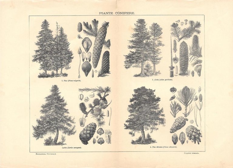 Piante conifere. Lexicon Vallardi 1900 ca.
