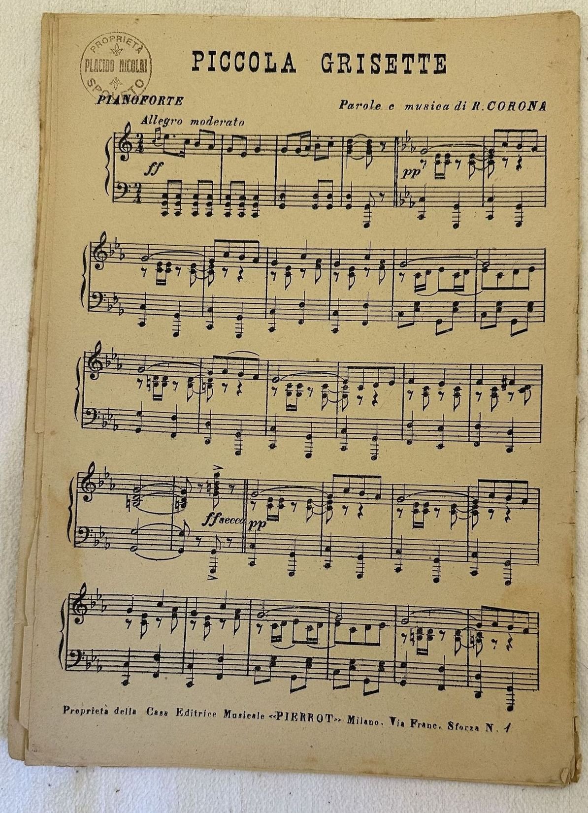 Partitura completa per orchestra del 1928 della melodia di Romolo Corona "Piccola Grisette".<BR>Copertina assente. GENERE: Fox trot STRUMENTI: pianoforte, violini; violoncello, tromba, trombone, contrabbasso, flauto, clarinetto, batteria<BR>ANNO: 1928 DIMENSIONI: In 8. cm 25x18 PAGINE: pp. 11 CONDIZIONI: Ottime condizioni. Ex libris in copertina. Legatura assenteComplete score for orchestra of 1928 of the melody of Romolo Corona "Piccola Grisette". Cover lacks MUSIC: Fox trot STRUMENTI: piano, violin; trumpet, trombone, violoncello, contrabass, flute, clarinet, drums<BR>YEAR: 1928 SIZE: In 8. cm 25x18 PAGES: pp. 11 CONDITIONS: Good conditions. Ex libris in the cover <BR><BR>