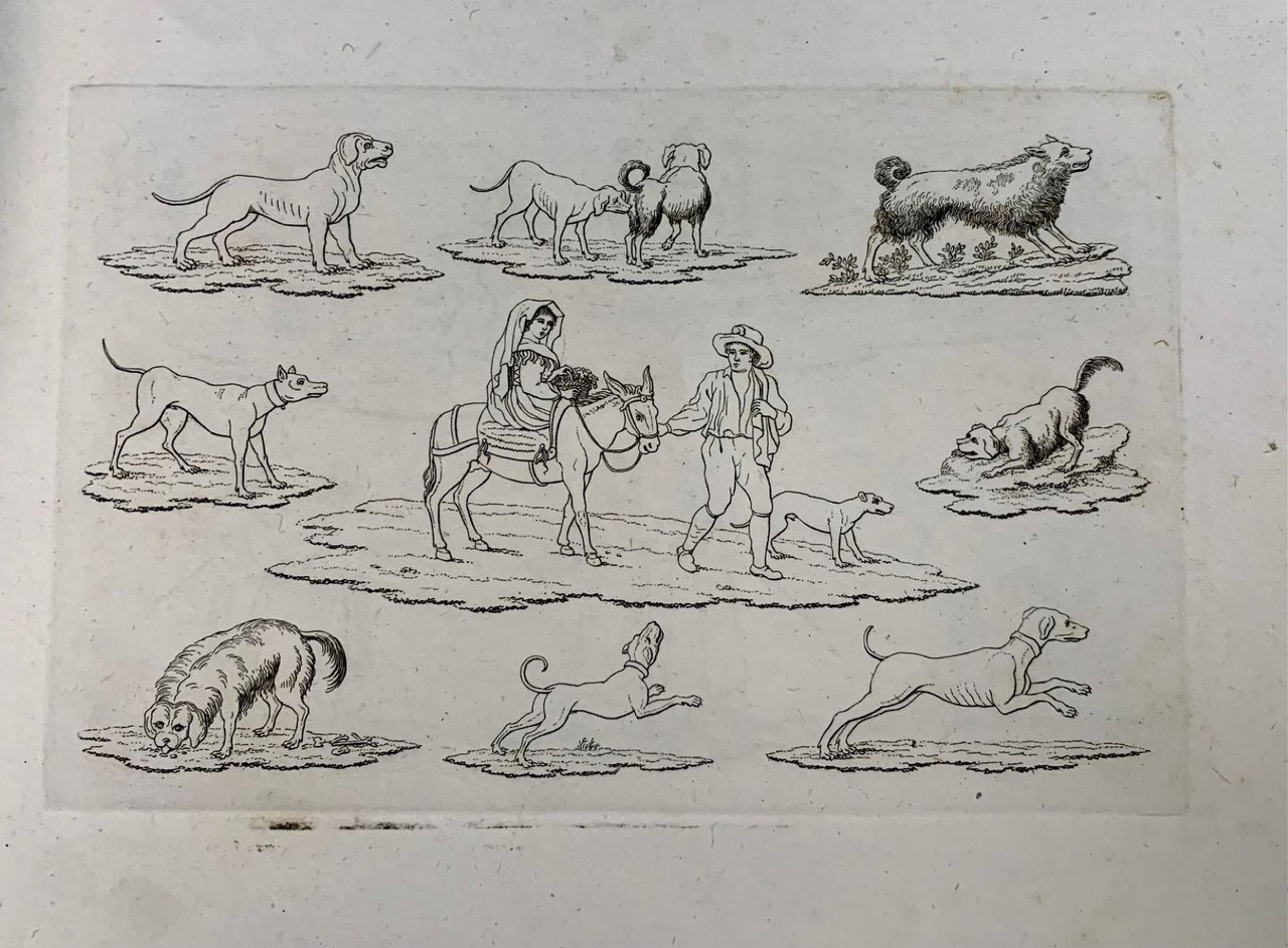 >Album in-4 oblungo ( mm 220x295), titolo e 12 tavole incise in rame, legatura in cartonato rustico. Scene raffiguranti figure e paesaggi riprodotti dal vero con un segno nitido, accurato e leggero. Sono presenti maschere della Commedia dell'Arte, giocatori di bigliardo, cani, donne intente a lavorare a maglia, spazzini, soldati, venditori ambulanti, carrozze, cavalieri, allevatori di bestiame, fumatori di pipa etc.