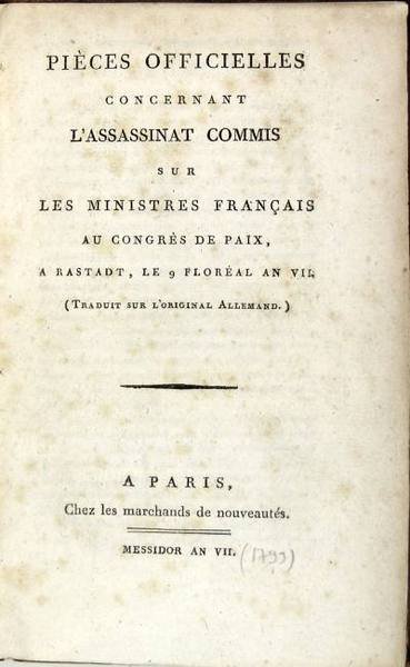 Pieces officielles concernant l'assassinat commis sur les ministres français au Congrès de Paix, à Rastadt, le 9 floréal an VII (traduit sur l'original allemand)