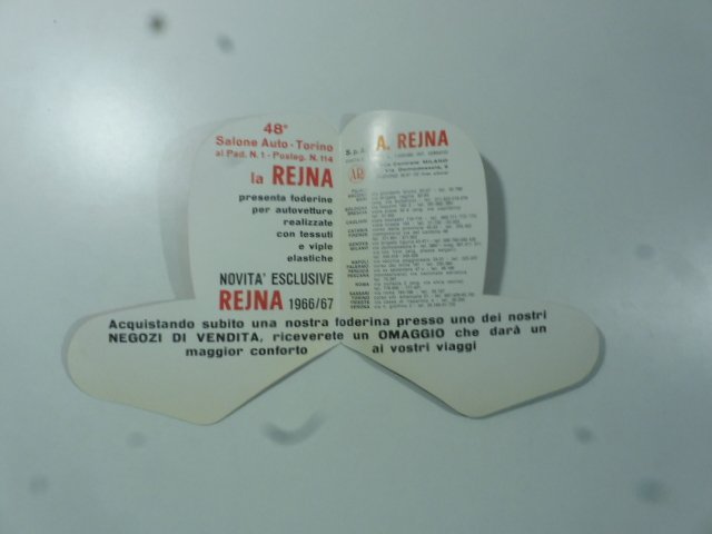 Pieghevole fustellato cm 7 x 14,5 circa delle foderine per automobili Rejna riproducente il sedile di un'autovettura, all'interno alcune note relative al Salone dell'auto di Torino e l'elenco delle filiali Rejna in Italia.