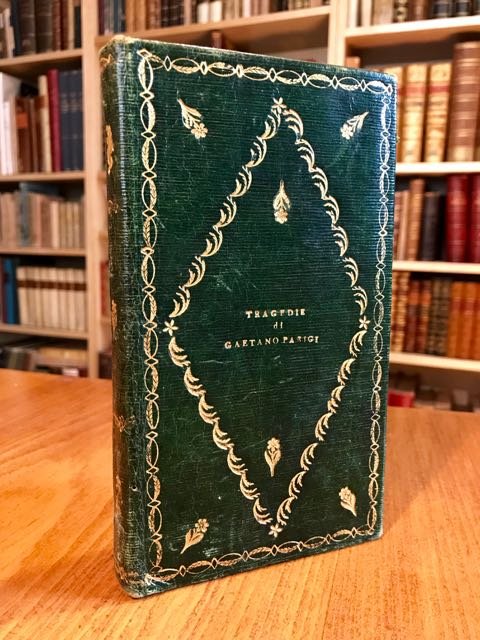2 volumi in 1 in-8° (cm. 17,7), graziosissima legatura coeva in p. pelle verde con titolo al piatto anteriore e fregio al piatto posteriore inquadrati da motivo floreale geometrico a forma di rombo e cornice floreale con fregi in oro, altri fregi floreali in oro al dorso, tagli spruzzati, risguardi in splendida carta floreale; pp. 72, 72 in ottimo stato e su carta greve; lievissime fioriture. Edizione originale di entrambe le tragedie dell'attore e drammaturgo del piccolo paese lombardo di Pontevico. Superbo esemplare. (SO4)