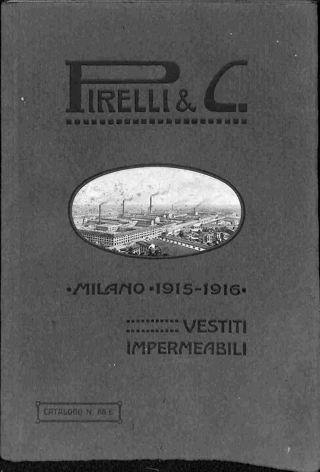 In 8 (cm 16,5 x 24), pp. 108 con 49 illustrazioni a piena pagina. Brossura editoriale con piccola vedutina dello  stabilimento illustrata e montata entro ovale al piatto anteriore. Bellissimo catalogo illustrato in nero di impermeabili e vestiti Pirelli fra i quali modelli tipo Iberia, Slesia, tipo Universale, vari modelli posrtivi da uomo e da donna (denominati mediante lettera dell'alfabeto), pastrano per ufficiali a cavallo, impermeabile con mantellina per ufficiali, modello di impermeabile Tor di Quinto 1915, cappotto modello Capannelle, cappotto per Ufficiali di marina; impermeabile per vigili urbani, modelli di impermeabile a camiciotto, giacca per motociclisti con coprigambe, mantellina per cacciatori, mantellina per cacciatori e ciclisti, coprispalle per fattorino con maniche o senza, soprabito per cocchiere, vestito completo per minatore, vestito completo per manovratore, calzoni e calzettoni, ecc.