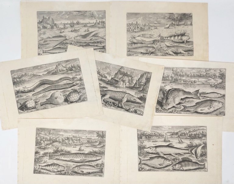 Prima edizione di questa famosa raccolta d'incisioni di pesci,  balene, tartarughe, testuggini, molluschi, crostacei e coccodrilli.  Adriaen Collaert raggruppa la fauna marina in gruppi simili, fornendo a ciascun elemento il suo nome scientifico. Il paesaggio sullo sfondo è tratto dalle vedute montuose e dagli edifici dipinti da Pieter Brueghel il Vecchio. Le conchiglie sparse in primo piano non sono identificate con un nome, nonostante siano fedelmente riprodotte svolgono un ruolo meramente decorativo. Alla fine del XVI secolo, la storia naturale era basata sull'osservazione diretta e la rappresentazione della natura svolgeva un ruolo essenziale nello sviluppo del metodo scientifico.